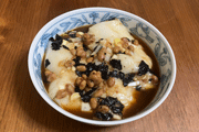 「大根汁納豆餅」亡き父の故郷の味で、山形でもその地域限定の食べ方だったそうです。大根のおろし汁に納豆と刻みのり、ねぎ、鰹節を混ぜ、餅にからめます。ピリッと辛くてツルツル、そして栄養満点。いつのまにか私の好物に。納豆が苦手な人でもいけると思います。